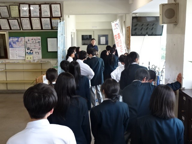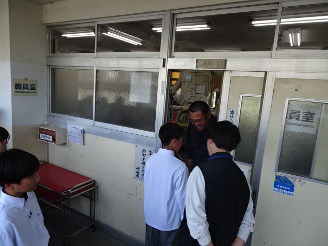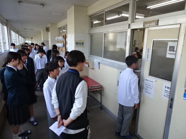 クラスごとにフロアを廻り、特別教室棟等の場所を確認しました。職員室前では「入室の仕方」(ノックをする、名前を名乗る)について実際にやってもらいながら確認していました。