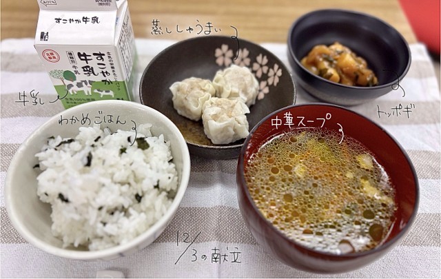 今日は中華スープ、蒸しシュウマイ、トッポギの日でした。人気献立です。