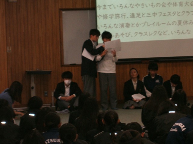 プレイルームの仲間が畑で育てたサツマイモをみんなで収穫して、それを大学いもにして食べました。学年別のレクのあと、全体会で3年生が3年間を振り返りと仲間への思いを伝える交流を行いました。ゲストで来てくれた三中の卒業生がそんな姿を見て、コメントしてくれました。とても素敵な会になりました。