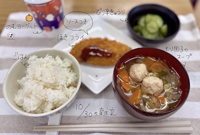 今日の給食は、飲むヨーグルトがハロウィン仕様でした。