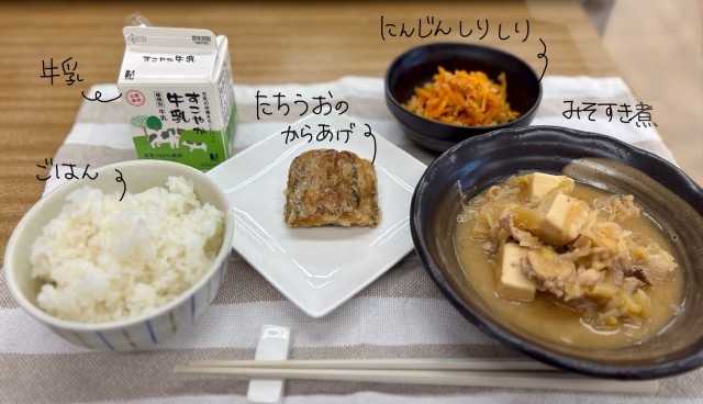 今日はみそすき煮、太刀魚の唐揚げ、人参しりしりでした。