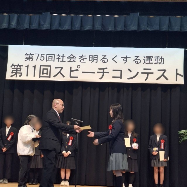 第75回社会を明るくする運動のスピーチ大会が実施され、2年生の代表が立派にスピーチを行い、PTA協議会賞を受賞しました。とても立派なスピーチでしたよ。