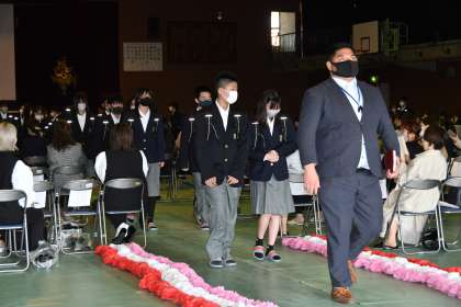 今後、一刻も早く、保護者の皆さまに信頼され、「先生まかせたで」とおっしゃっていただけるよう、そして三年後、心から「おめでとうございます」と胸を張って言えるよう努力してまいる所存です。より一層のご支援、ご協力を心よりお願い申し上げ、式辞といたします。