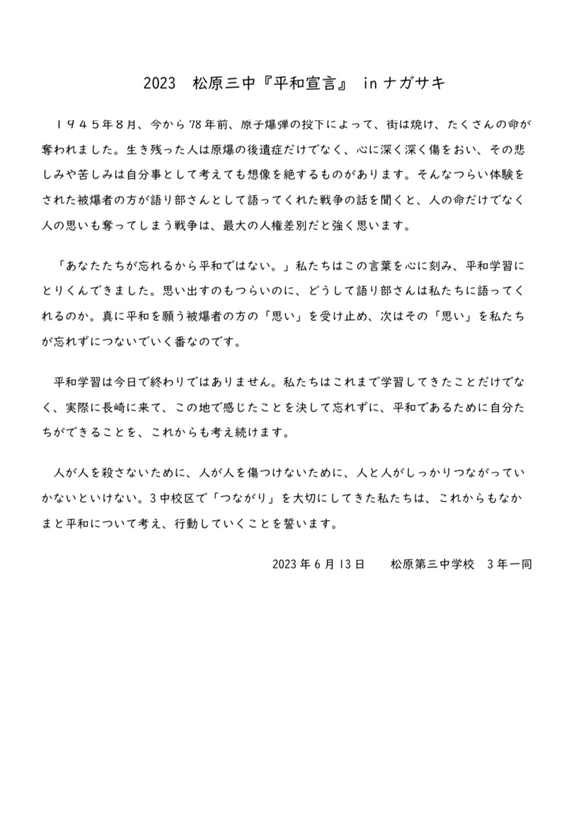 2023 松原三中『平和宣言』 inナガサキ