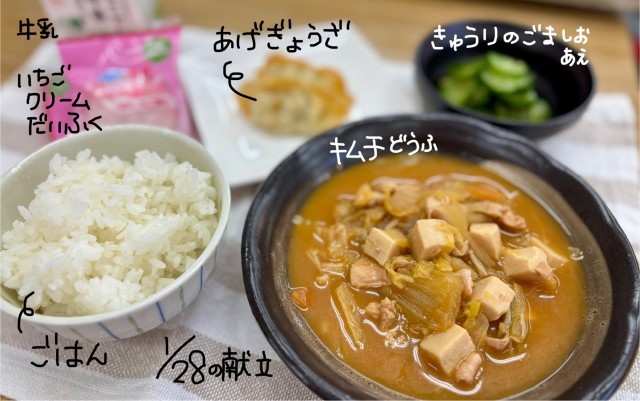昨日はキムチ豆腐、揚げ餃子、きゅうりのごま塩和え、いちごクリーム大福でした。デザート付きの日でした。