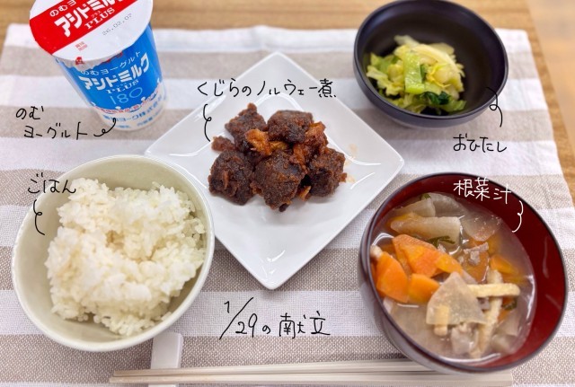 昨日は根菜汁、クジラのノルウェー煮、おひたしでした。