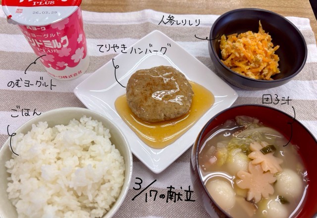今日の給食は、飲むヨーグルト、ご飯、だんご汁、照り焼きハンバーグ、人参しりしりでした。