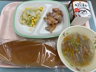 今日の献立は、コーヒー牛乳、コッペパン、レタスのスープ、鶏肉のオレンジソース、こんにゃく寒天のサラダです。給食が始まって、1週間が経ちました。給食当番の人も徐々に慣れてきたように思います。全体的に鶏肉のオレンジソースとコーヒー牛乳が人気でした。毎日おはしが必要になってきますので、忘れずに持ってきてくださいね。