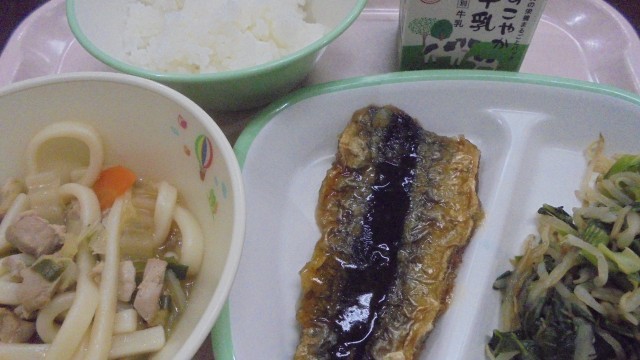 さて、今日の給食は、牛乳、げんりょうご飯、さんまの照り焼き風、五目うどん、お浸しでした。五目うどん温かくて美味しかったです。ごちそうさまでした!