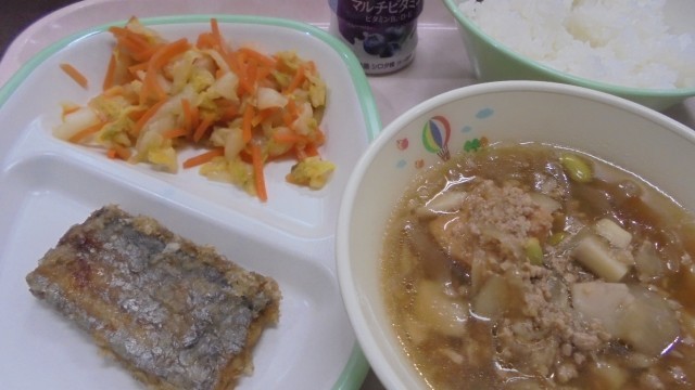 さて、今日の給食は、乳酸菌飲料、ご飯、たちうおの唐揚げ、ゆず和え、里芋のそぼろ煮でした。たちうおの唐揚げ美味しかったです。ごちそうさまでした!
