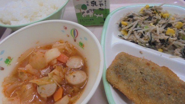 さて、今日の給食は、牛乳、ご飯、米粉いわしフライ、ごぼうのソテーサラダ、トマトのスープ煮でした。今日は「かみかみ献立」でした。ごちそうさまでした!