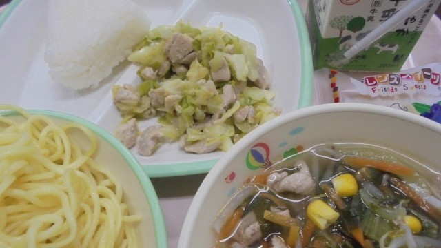 さて、今日の給食は、牛乳、おにぎり、肉野菜炒め、塩ラーメン、ブルーベリータルトでした。ラーメンが温かくて美味しかった。肉野菜炒めもにんにくがきいていて美味しかったです。ごちそうさまでした!