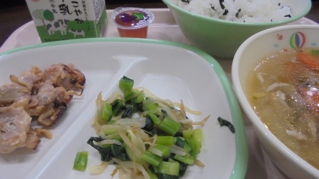 さて、今日の給食は、牛乳、わかめご飯、鶏肉の西京焼き、からし和え、みぞれ汁、一口ぶどうゼリーでした。鶏肉の西京焼きの味付け美味しかったです。ごちそうさまでした!