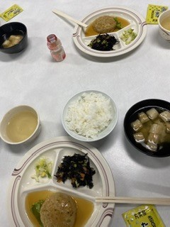 朝食は、ご飯、味噌汁、ハンバーグ、ひじき等です。文化委員が準備してくれました。