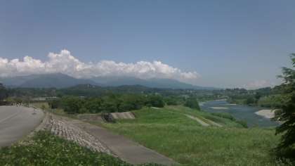 曇で全ては見えませんが、正面が中央アルプスの山々です。右手がラフティングをした天竜川です。午前中の活動が終わりました。そろそろ昼食場所へ出発です。
