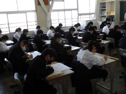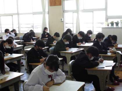 テスト中の様子です。どの学年も真剣に問題に向き合っていました。普段にはない姿です。制服にそろえての受験よくできていました。