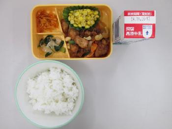 今日のメニューは、ぎゅうにゅう、ごはん、こんにゃくサラダ、セルフまぜごはん、とりにくのカシューナッツいため、バターコーン です。