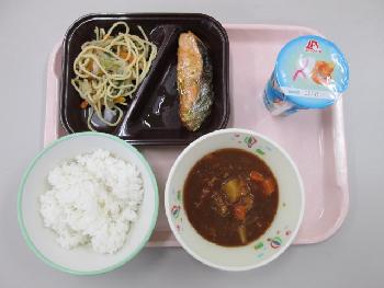 今日のメニューは、 飲むヨーグルト、ご飯、ブラウンシチュー、鮭のバジルソース、レタスとツナのスパゲティ です。