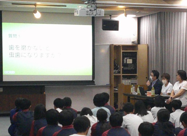 2年生は、総合学習室で学校歯科医の先生や歯科衛生士の方を講師にお招きして、歯科衛生指導を行いました。歯の磨き方や歯ブラシの使い方などをていねいに教えていただき、事前アンケートでの質問に対してたくさん回答していただきました。