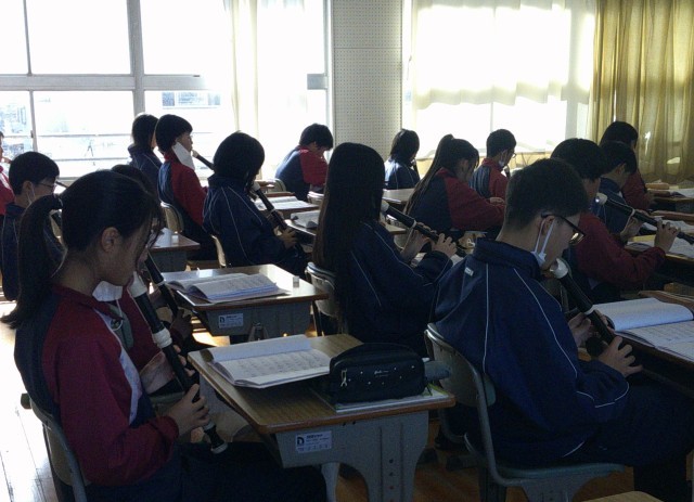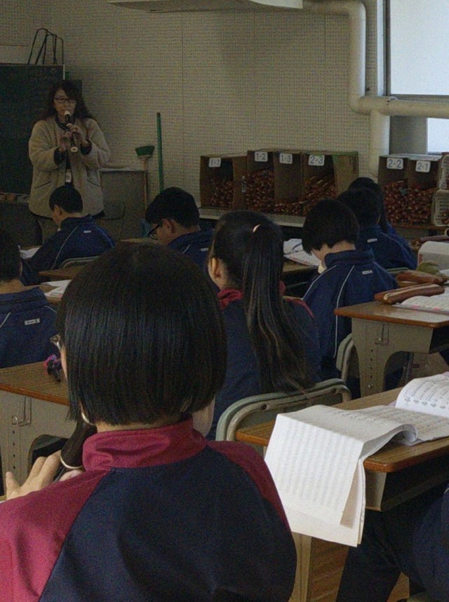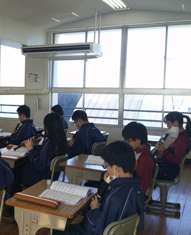 1年生の音楽では、アルトリコーダーの授業に取り組んでいます。楽譜を見ながら、みんなで「アメージンググレイス」「大きな古時計」「おどるポンポコリン」などを演奏していました。中学校に入学して初めて吹き始めたアルトリコーダーですが、みんなすてきな音色を奏でていました。