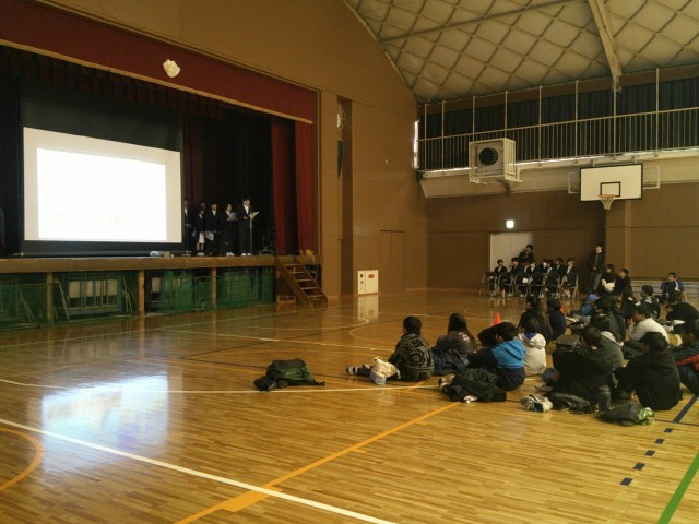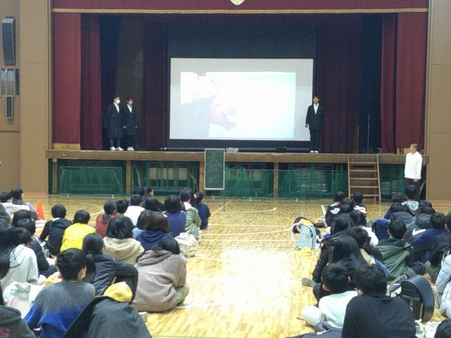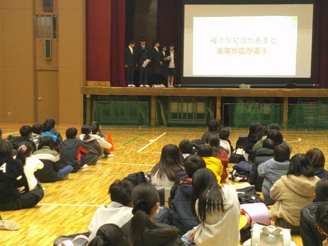 生徒会本部より、五中の一日の流れ、部活動、生徒会活動などをプレゼンしました。その後、各学年より課題解決学習の成果を発表しました。3年生は8月7日万博会場で発表した様子を動画で、1.2年生は代表班が発表しました。1.2年生は緊張していましたが、小学生に向けて堂々と発表することができました。最後に6年生のみなさんからの質問に答えて、終了しました。