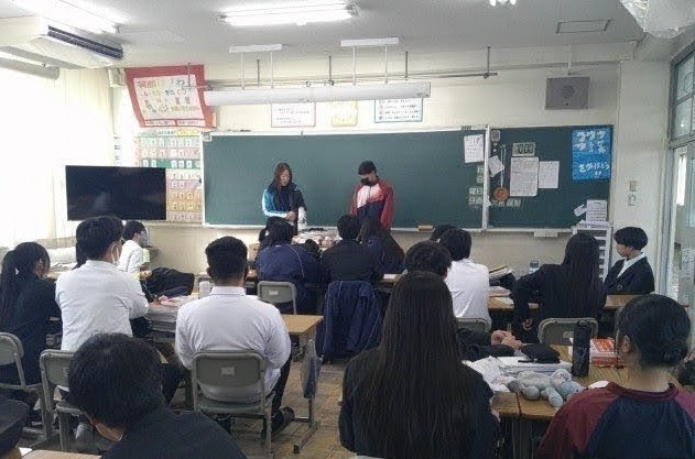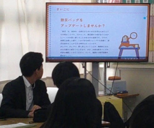 生徒会本部のメンバーが、五中生全員に防災バッグを知ってもらうために、朝学活の時間をもらって全クラスに説明しに行きました。