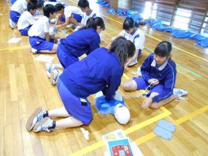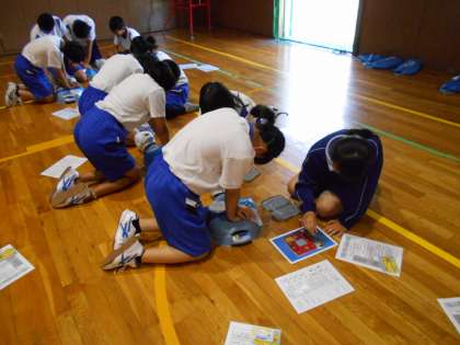 AEDの使用方法の講習も受け、練習用のセットを使わせていただき、実践しました。