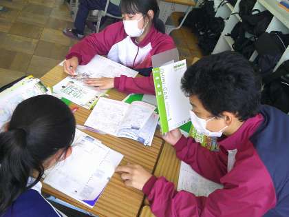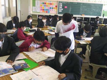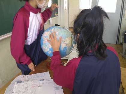 授業の中で地理が得意な生徒が班の仲間に教えてくれていました。また、同じ問題を取り組む仲間同士、席を移動し共に考えていました。地球儀が登場すると、興味津々。「あ〜でもない。こ〜でもない」と、それぞれが研究を始めていました。