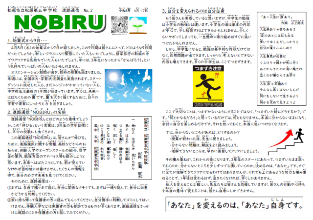 3年生には進路通信NO2のびるを配布しています。ご覧ください。なお、1,2年生もご覧いただけるように、ホームページ配布文書に掲載しています。