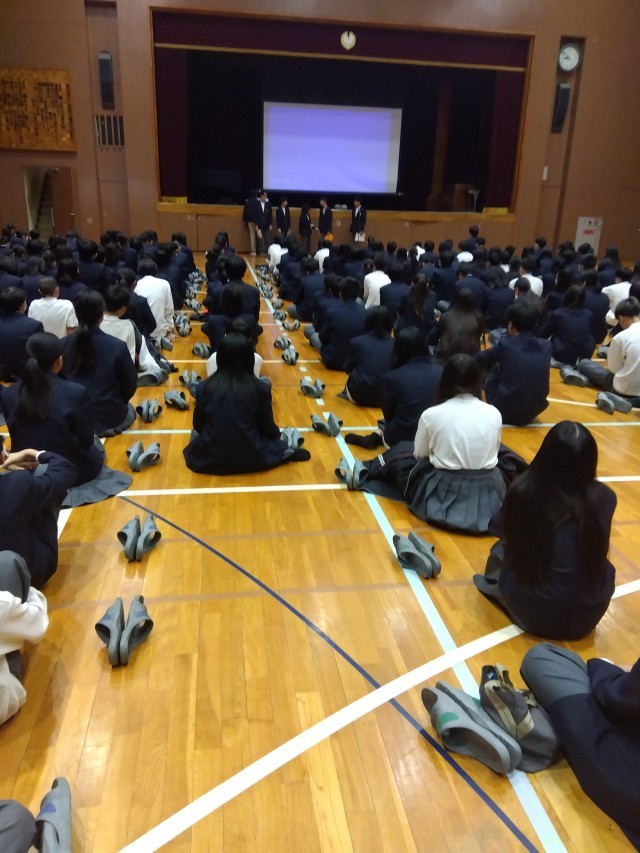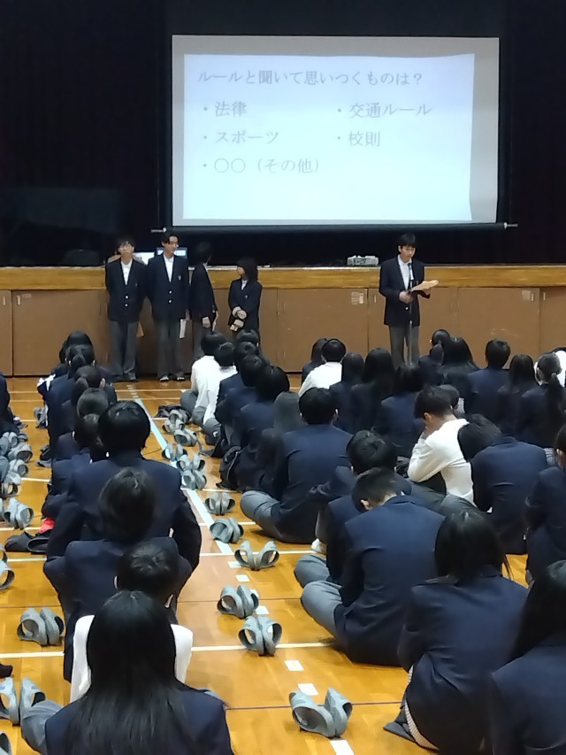 生徒集会では来年にむけて、校則に関しての話がありました。みんなで校則について考える機会になればと思います。