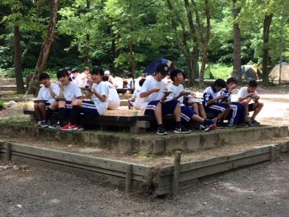 昼食のカレーは、みんなで作りました。おいしかったです。早く食べおわったクラスは「だるまさんがころんだ」を楽しみました。