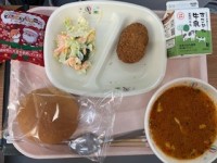 今日の給食の献立は、牛乳、ご飯、ポトフ、焼きそば風、フルーツミックスです。今日のポイントは「切り干し大根」です。