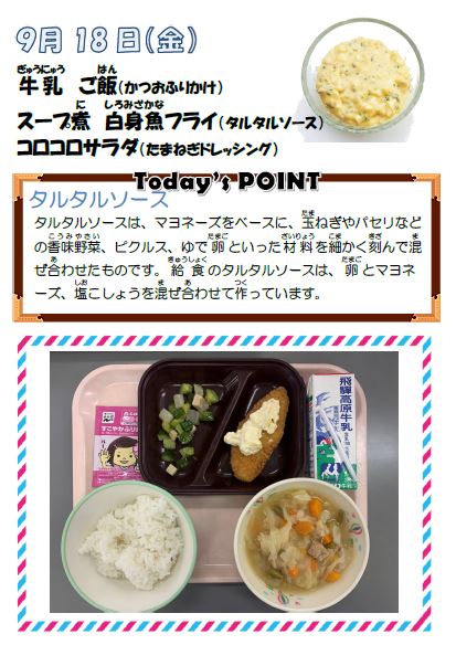 今日の給食の献立は、牛乳、ご飯(かつおふりかけ)、スープ煮、白身魚フライ(タルタルソース)、コロコロサラダ(玉葱ドレッシング)です。きょうのポイントは、「タルタルソース」です。