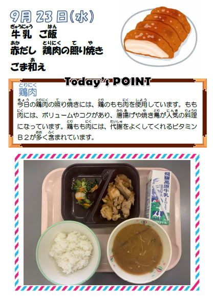 今日の給食の献立は、牛乳、ご飯、赤だし、鶏肉の照り焼き、ごま和えです。今日のポイントは、「鶏肉」です。
