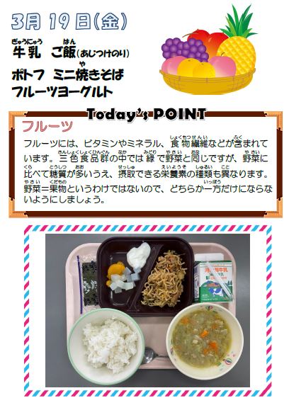 今日の給食の献立は、牛乳、ご飯(味つけのり)、ポトフ、ミニ焼きそば、フルーツヨーグルトです。今日のポイントは「フルーツ」です。