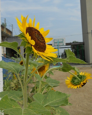 ボランティア活動で種を植え、その後は各クラスが輪番で水やりをしました。夏空に向かって微笑んでいるようです…(^_^)v