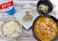 初日の献立は、飲むヨーグルト、ご飯、八宝菜、鶏肉の黒酢、フルーツミックスです。