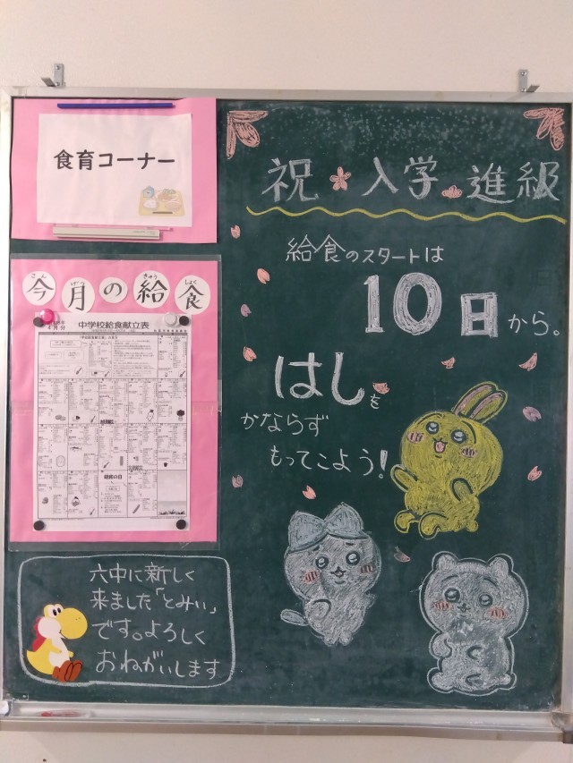 10日より給食が始まります。写真は、今年度より六中の栄養教諭と赴任された冨井先生...