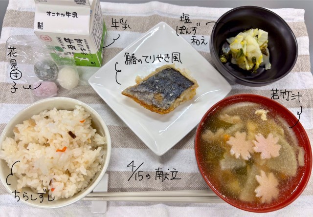 今日はお花見献立でした。牛乳、ちらし寿司、若竹汁、鰆の照り焼き風、塩ポン酢和えで...