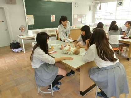 城南学園高等学校は、保育(赤ちゃんのお世話)を体験しました。松原高校は、コミュニケーションゲームをしていただきました。わいわいと楽しそうです。