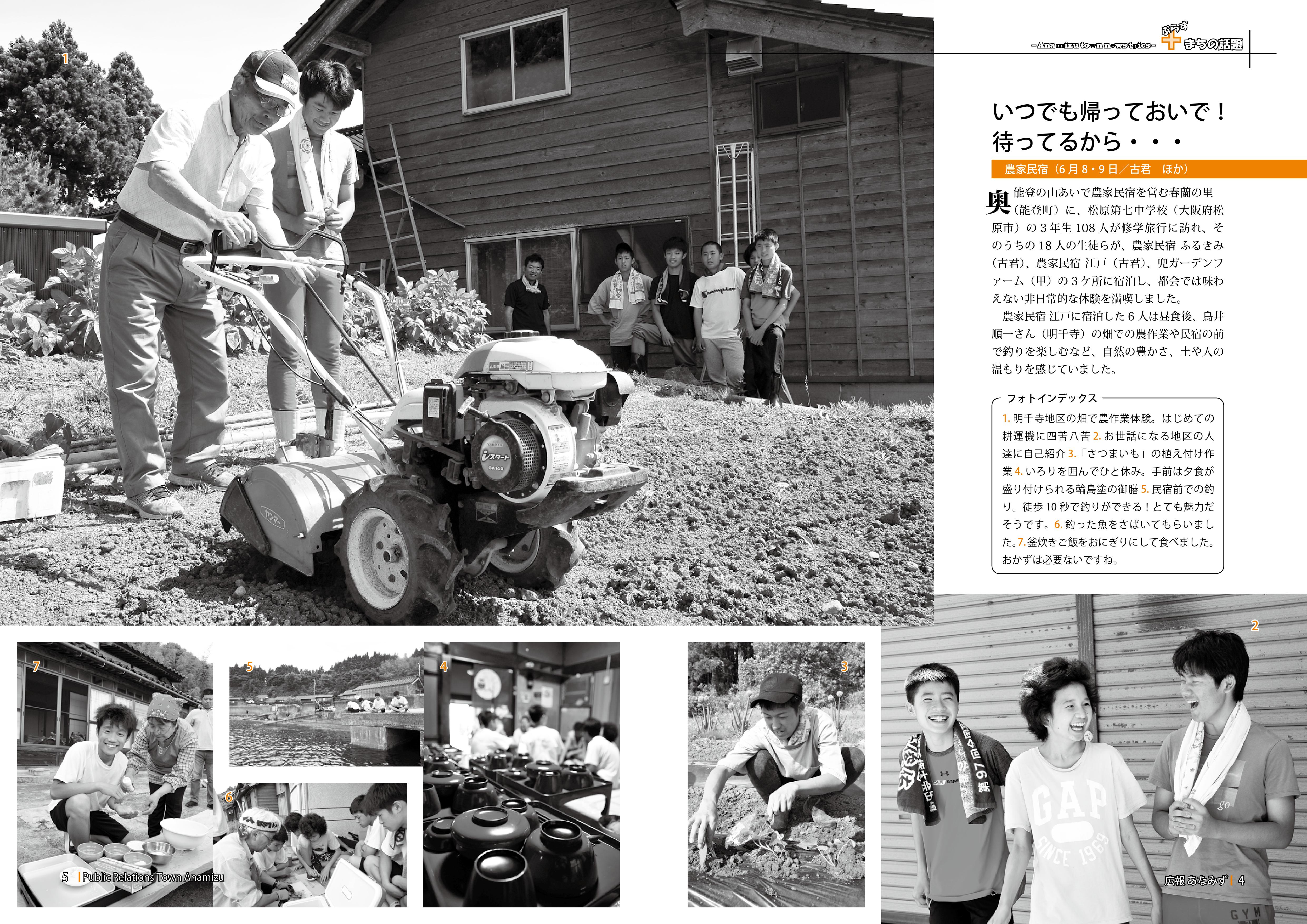 いつでも帰っておいで!待ってるから・・・。奧能登の山あいで農家民宿を営む春蘭の里(能登町)に、松原第七中学校(大阪府松原市)の3年生108人が修学旅行に訪れ、そのうちの18人の生徒らが、農家民宿 ふるきみ(古君)、農家民宿 江戸(古君)、兜ガーデンファーム(甲)の3 ケ所に宿泊し、都会では味わえない非日常的な体験を満喫しました。農家民宿 江戸に宿泊した6人は昼食後、鳥井順一さん(明千寺)の畑での農作業や民宿の前で釣りを楽しむなど、自然の豊かさ、土や人の温もりを感じていました。(「広報あなみず」より)