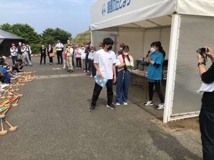 競技が終わって表彰式です。3つのコースそれぞれの優勝チームとホールインワンをした2人には記念の「カニの爪」などの賞品が贈られました。