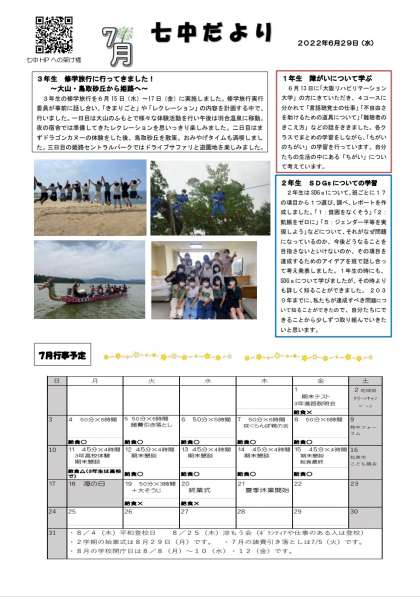 本日、生徒のみなさんに「七中だより 7月号」を配布しています。ご確認ください。