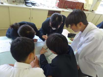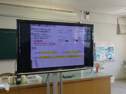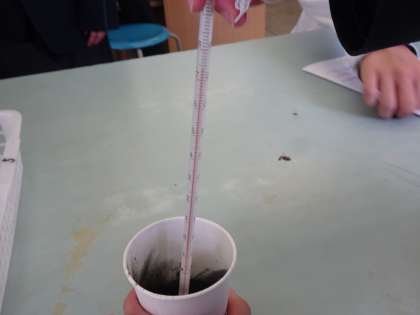 理科の実験。化学カイロ の実験を行いました。鉄粉・活性炭に、食塩水を投入、混ぜるとどんどん温度が上がっていきました。化学の不思議。子どもたちは、興味深く実験に取り組んでいました。
