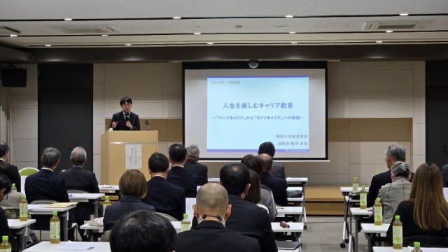 講演は静岡大学教育学部の准教授である塩田真吾様を講師に迎え、「人生を楽しむキャリア教育」というテーマで講演が行われました。講演中には、参加者がグループに分かれて活発に意見を交換する時間が設けられ、各教育委員がキャリア教育に対する視点を深め、具体的な取り組みや課題について意見を交わしました。