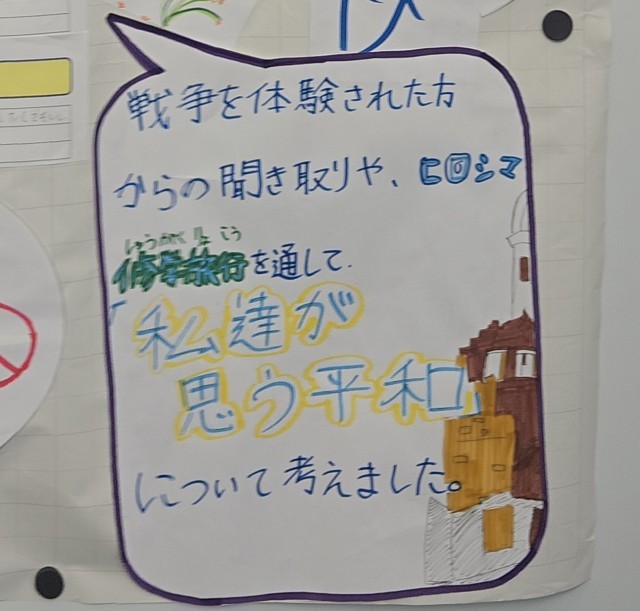 6年生は戦争を体験された方からの聞き取りやヒロシマ修学の経験を通じて、それぞれが戦争について向き合い、平和に対する思いを熱く語ってくれていますので、ぜひ皆さんお越しください。