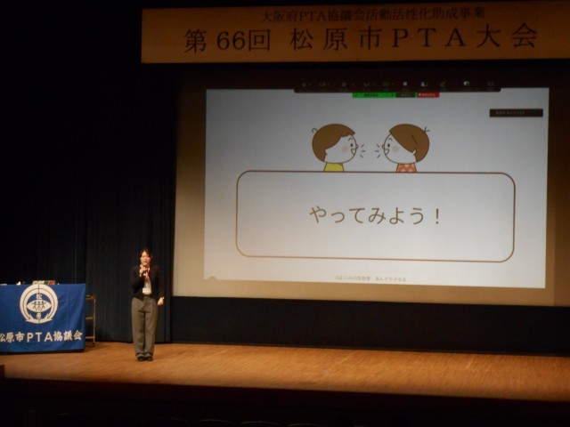 「話(はな)そう 聴(き)こう 向(む)き合(あ)おう~みんなちがってみんないい~」をスローガンに、今年度は松原小学校PTA・天美南小学校PTA・松原第四中学校PTAに事例発表をしていただきました。各校それぞれの特色が伝わり、PTA活動への思いを感じる発表でした。そして、非行防止啓発の三行詩の表彰とPTA写真展の表彰も行いました。