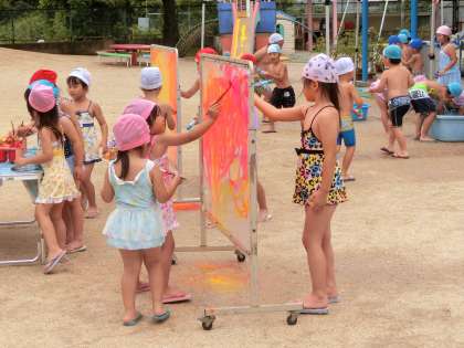 午後からは雨が止んでいたので、外で水遊びをしました。水鉄砲で遊んだり、らくがきボードに絵の具でお絵かきしたり、子どもたちは笑顔いっぱいのびのびと遊んでいました。