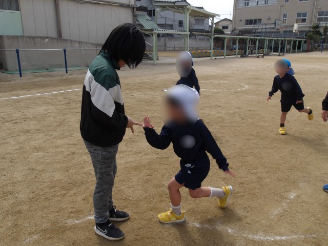 最後に、校庭で5年生とへびじゃんけんをしました。お兄さん、お姉さんに優しくかかわってもらい、みんなリラックスした表情で遊んでいました。
