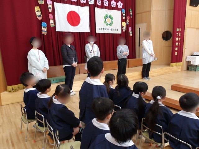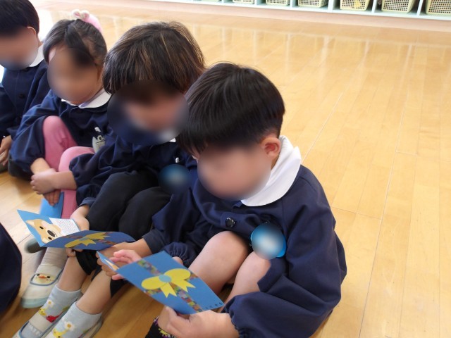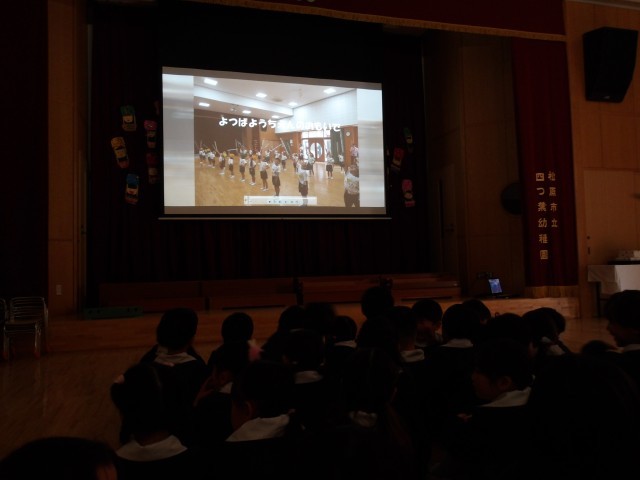 その後、先生から「四つ葉幼稚園での思い出」のビデオのプレゼントや、頑張りカードのプレゼントをしました。